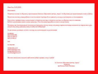 VAŽNO OBAVEŠTENJE Novi Sad, 15.03.2020. Poštovani, Teoretska nastava na obukama u prostorijama Zanatsko obrazovnog centra „Adžija“ se obustavlja dok traje vanredno stanje u Srbiji. Praktična nastava u preduzećima i kod poslovnih part..